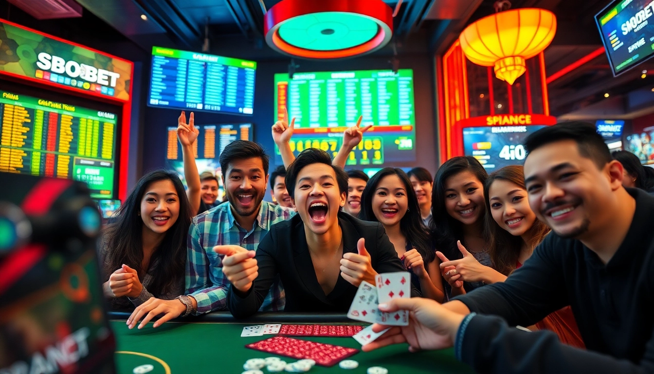 SBOBET.dance showcases an exciting online gambling scene with diverse players enjoying poker and sports betting.
